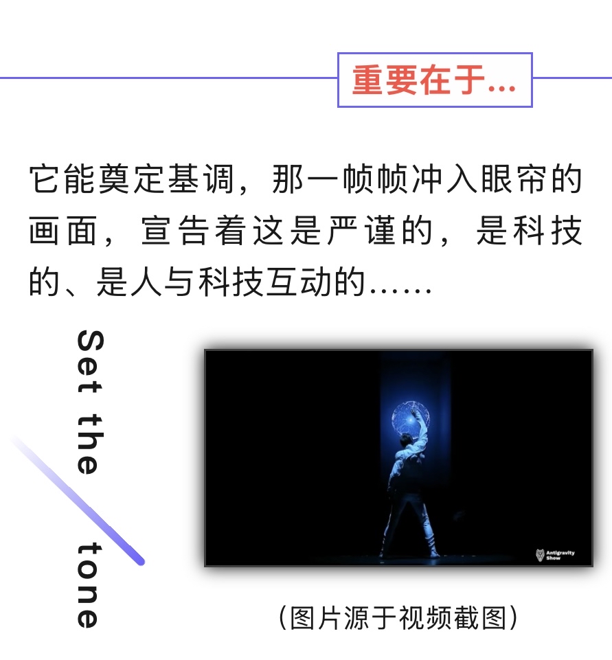 也是一场重点预告和品牌形象展示。短短的时间内,在牢牢抓住所有嘉宾和观众眼球的同时,提示整场活动的要点,又能告诉观众,这是谁的“场子”。