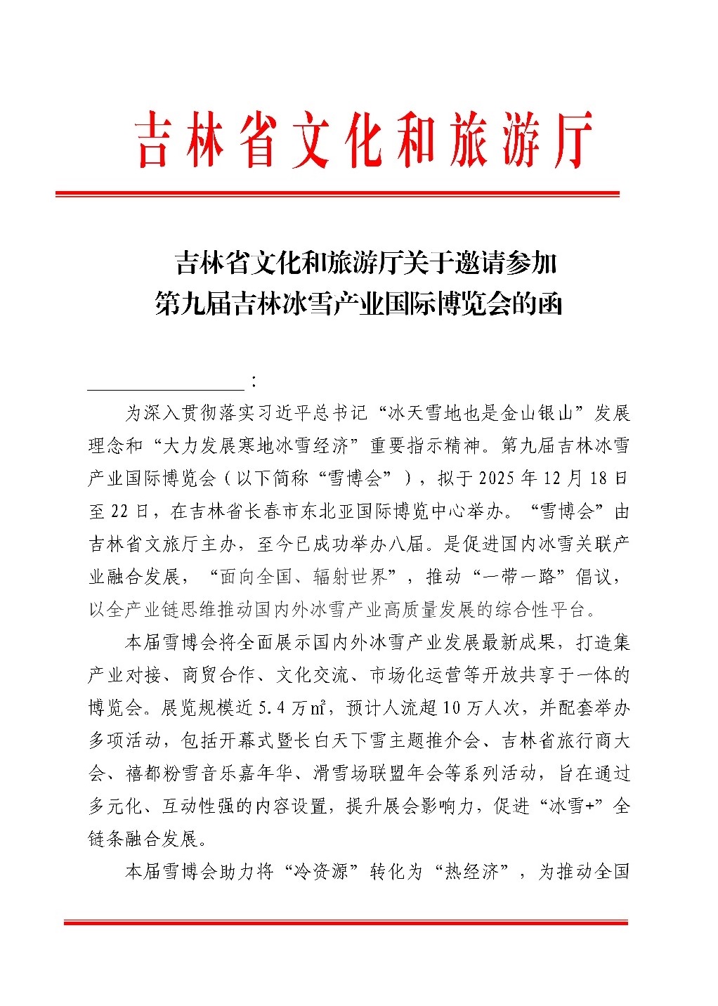 2025年12月18日-22日,第九届吉林雪博会将在长春东北亚国际博览中心举办!以“冰雪新生态·共享新未来”为主题,设五大展区,涵盖装备、运动、文旅等全产业链,配套音乐节、时装周等特色活动,邀企业参展、公众参与,共赴冰雪产业盛宴~