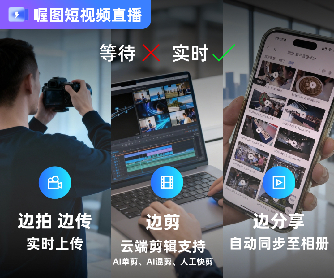 过去需要花 2-3 天等素材、等剪辑、等成片的环节,今天全部变成了 5 分钟内完成、当场可用。