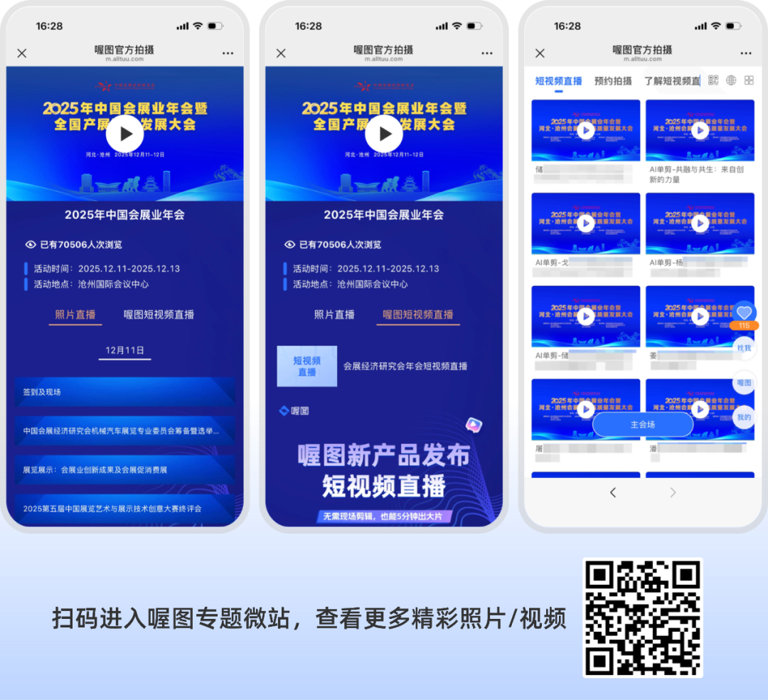 2025年中国会展业年会暨全国产展融合发展大会于12月11-13日在河北沧州举办,大会引入喔图「短视频直播」实现全流程内容生产与传播:现场生成28条短视频(7条活动花絮、21条嘉宾专属内容),大会专题微站获7w+人次浏览,短视频直播相册获2w+人次浏览,打破了会展内容传播“等素材、等剪辑、等传播”的传统节奏,实现活动实时传播。