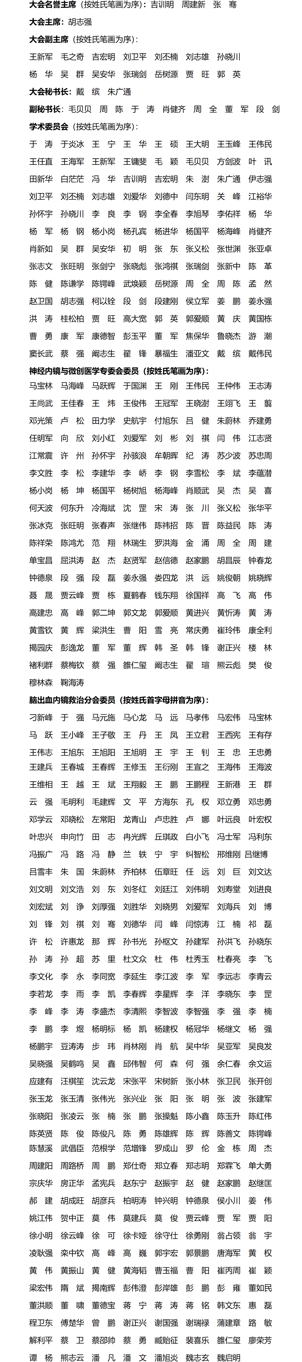 ◦ 征文内容:关于脑出血的早期识别、主动预防、大数据分析、药物治疗、院前及院内急救流程、外科规范化治疗、神经内镜手术治疗、机器人精准定位等人工智能技术、神经康复等亚专业的新技术、新方法和新进展。内容形式不限,如专题报告、病例总结、病例汇报等。欢迎大家积极投稿。◦ 投稿内容为论文摘要,包括:题目、研究目的、材料与方法、结果、结论;不超过800字;◦ 英文稿件用小4号Arial字体,中文稿件请用小4号宋体字,1.5倍行距;◦ 投稿请以word文档格式发送到征文联系人邮箱,请务必注明作者的联系方式(联系电话、E-mail地址)、单位名称、单位地址和邮政编码;◦ 组委会将择优录取,确定大会发言的人员和题目(大会现场颁发发言者讲者证书)。◦ 投稿方式:请于2025年12月25日前将您的稿件上传至网站,网站:meeting.cmea.org.cn。七、组织架构