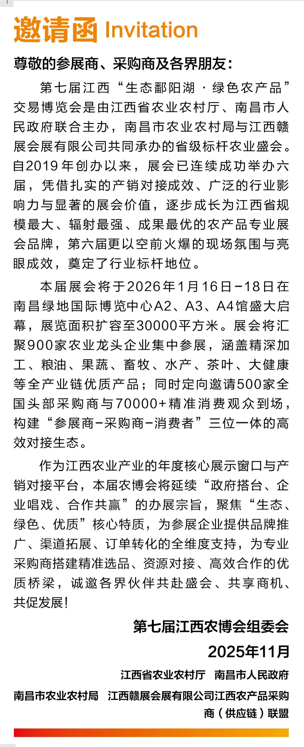 1月16日-18日,相聚南昌!江西农博会将聚焦“生态、绿色、优质”核心特质,诚邀各界伙伴共赴盛会、共享商机、共促发展!